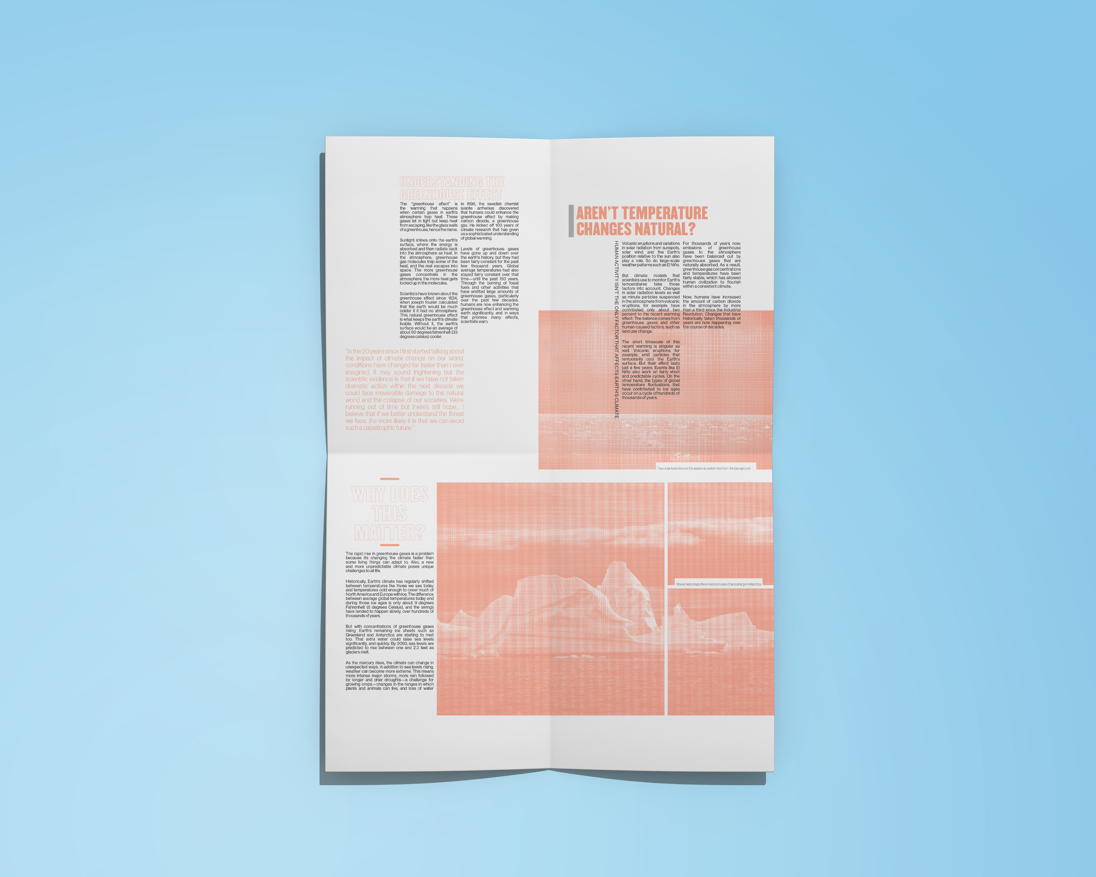 Global Warming Awareness Unfolding Posterzine Client - Personal Project The Brief - Create a printed publication based on my home town. The voice and tone of the book has to represent the location through the use of typography and imagery.
